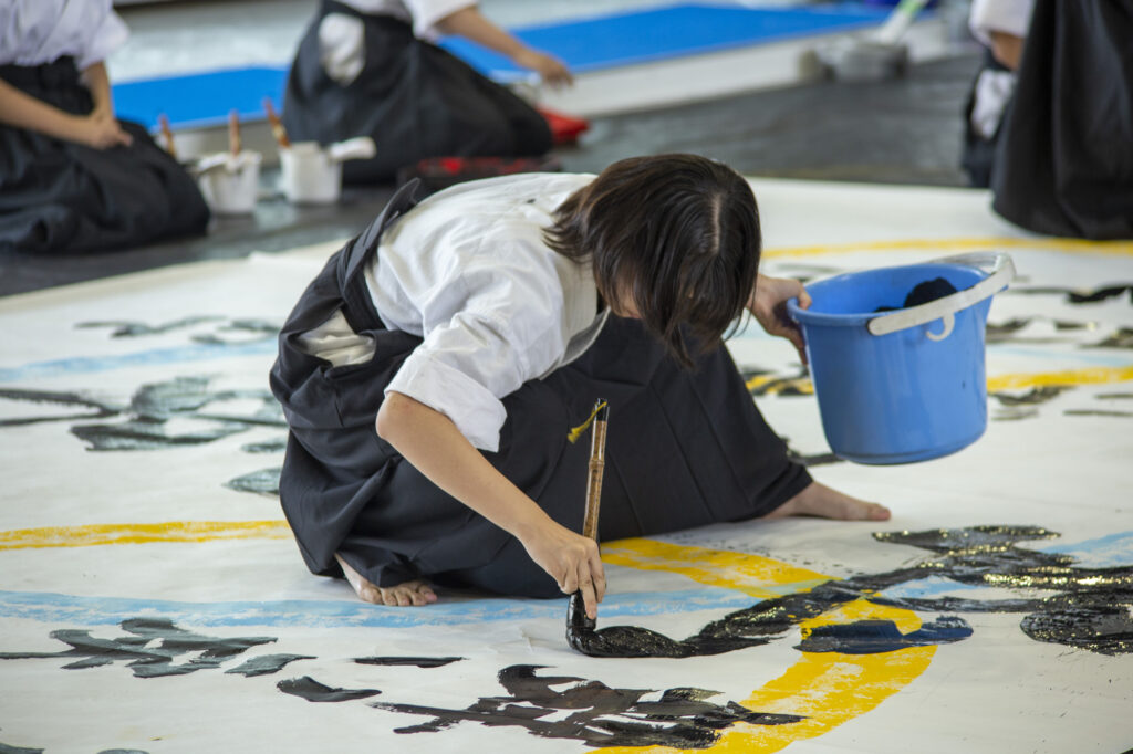 In calligraphy and Wa-Taiko drumming, students think about concepts to solve global issues.