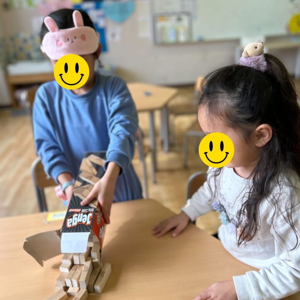 教室内でお友達と一緒に工作をしている子、カードゲームを楽しむ子。