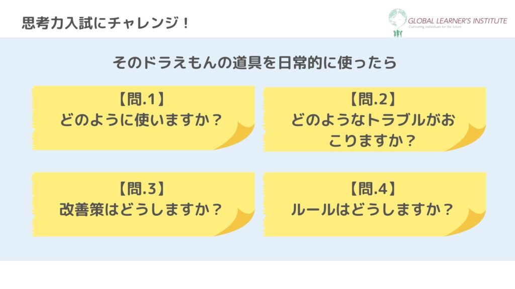前半はかえつ有明の今年度出題問題を使い「ドラえもんのひみつ道具(どこでもドア)」が日常にあったら?