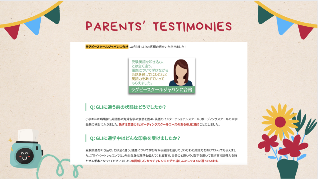 英検の結果や進学実績も発表します。彼らの生の声から、英語力の向上や成長を感じてください。