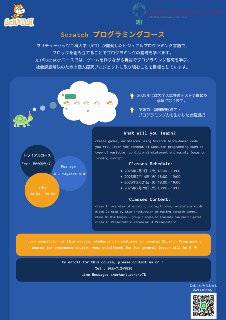 「Scratch 4回体験レッスン」に参加希望の方は、以下の「GLI公式LINE」のボタンをクリックして、「スクラッチ体験レッスン」のメッセージをお送りください。