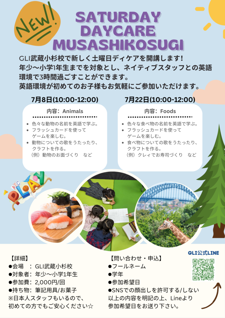 今回の「Daycare」に参加希望の方は、以下の「GLI公式LINE」のボタンをクリックして、「デイケア」のメッセージと「ご希望日(例:7/8など)」をお送りください。