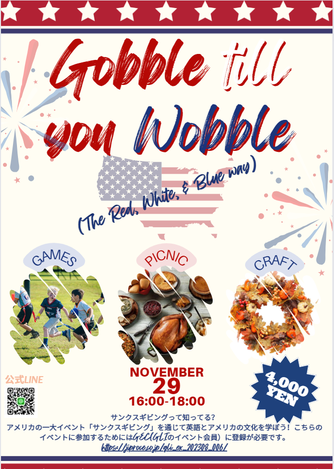 イベントのタイトル “Gobble til You Wobble “のように、この日は遊んだり、学んだり、食べたり、2時間思いっきり楽しみましょう!皆さんにお会いできることを楽しみにしています!