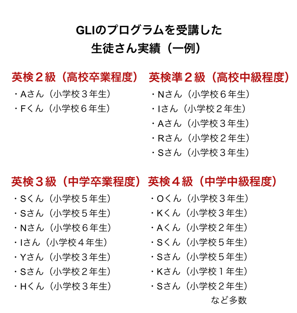 Now, at GLI,The purpose is to "develop global human resources" who can play an active role in the world,"An ordinary elementary school student with no overseas experience."evenObtained EIKEN Level 2.and has helped various students improve their English language skills.