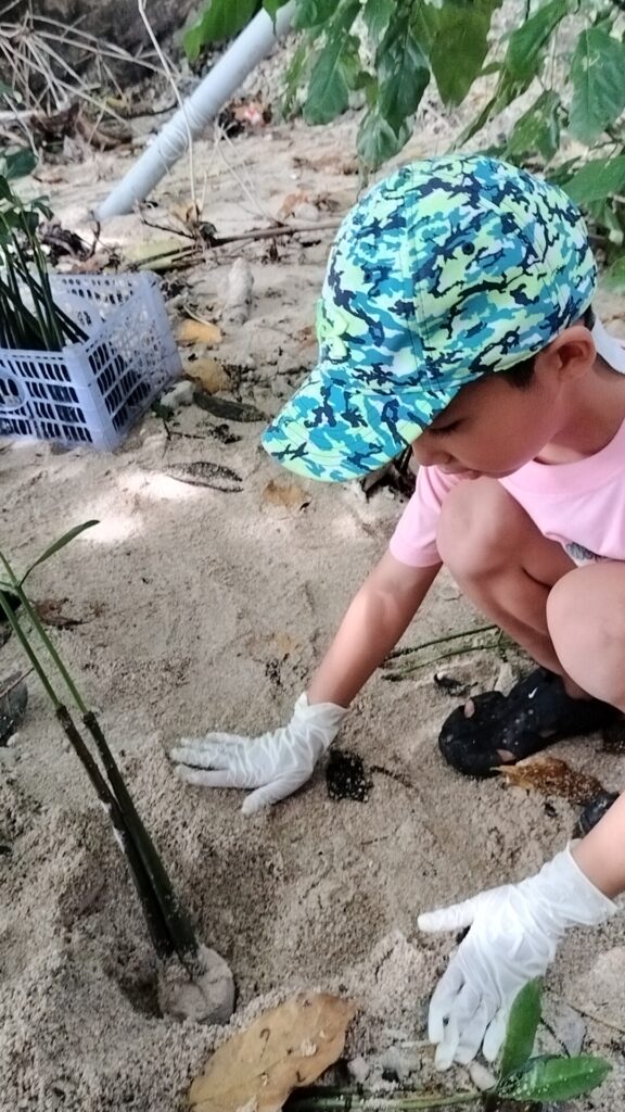 マングローブを植えることが命を守ることにも繋がっていると新しい学びにもなった子ども達は、1つ1つ丁寧にマングローブの苗を植えていきました。