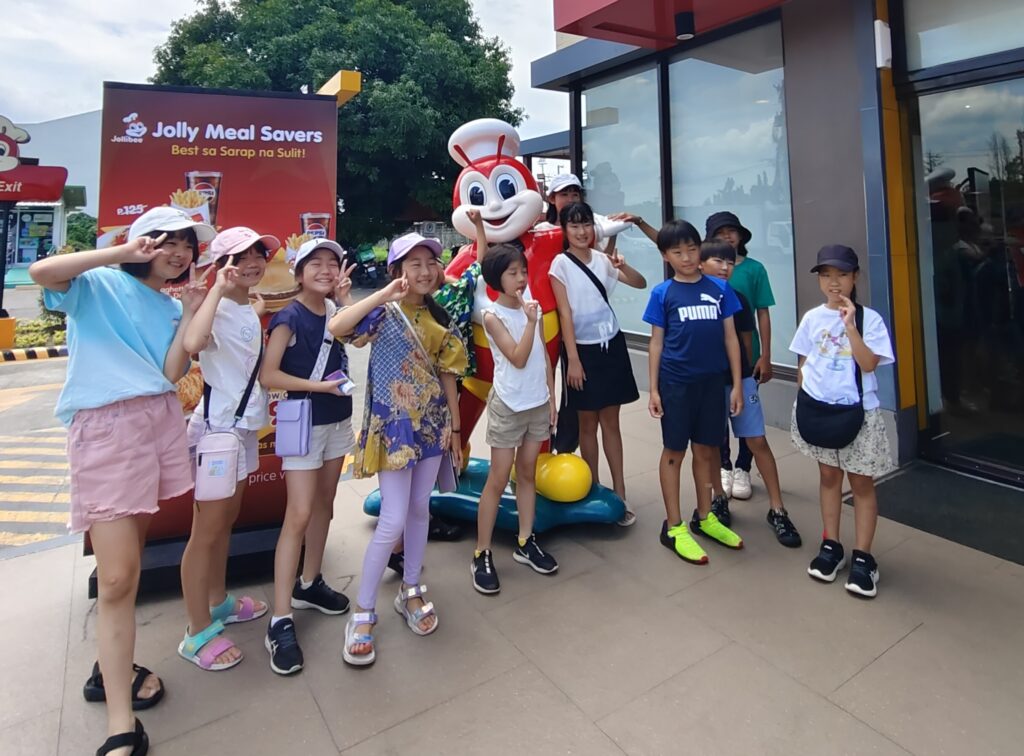 空港での長い待ち時間の間、子ども達は初めてフィリピンのソウルフード「Jollibee(ジョリビー)」を食べました!