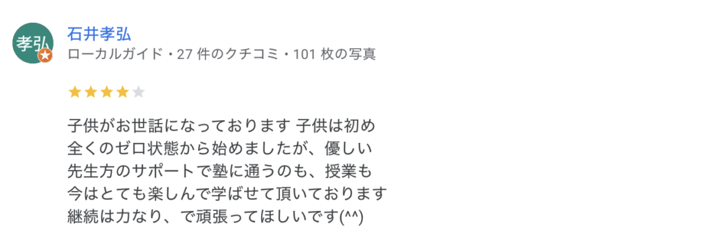 子供がお世話になっております 子供は初め全くのゼロ状態から始めましたが、優しい先生方のサポートで塾に通うのも、授業も今はとても楽しんで学ばせて頂いております継続は力なり、で頑張ってほしいです(^^)