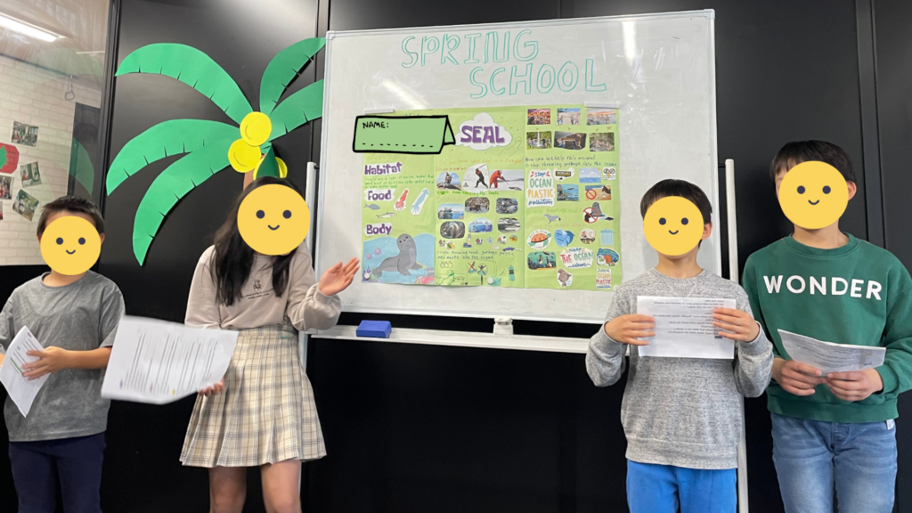 以小组为单位制作类似下图的 "海报",展示(输出)他们迄今为止所吸收的知识、我想了解更多,不仅仅是英语语言技能!我想了解更多!并进一步激发兴趣。