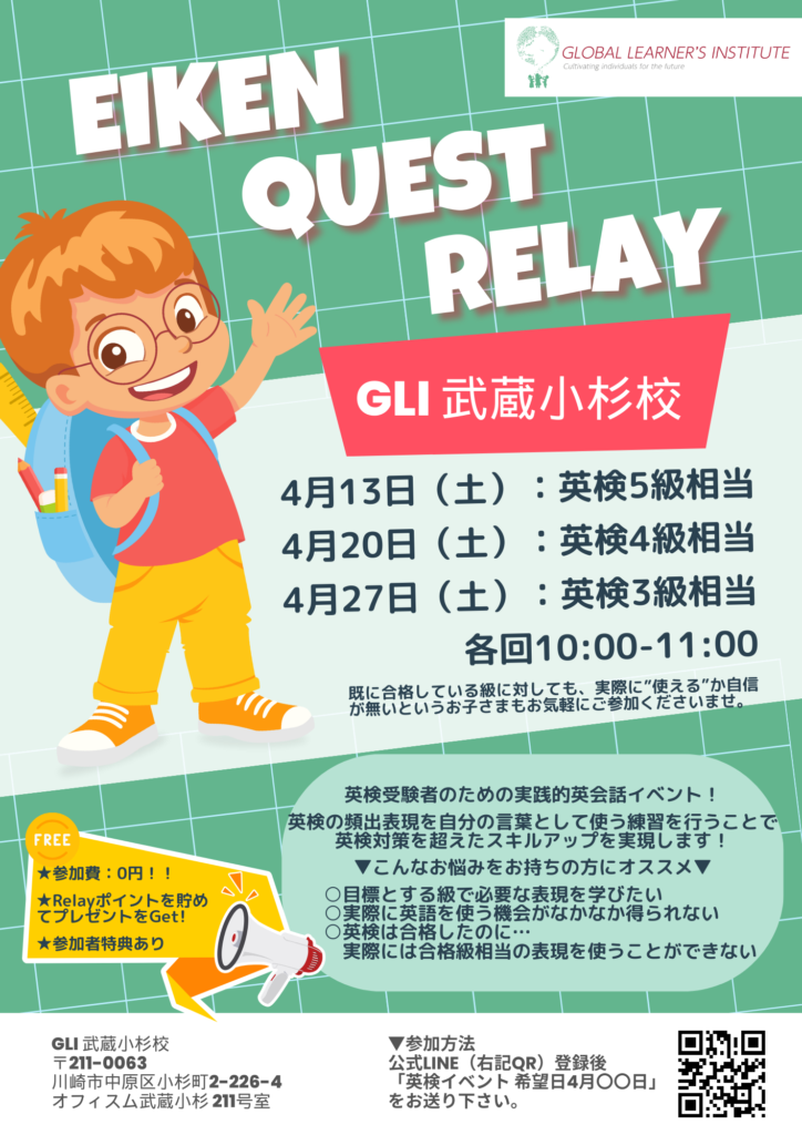 如果您想参加 Eiken Quest 接力赛,请点击下面的官方 GLI 线路按钮、英语测试活动 "信息和您希望参加的日期(如 4 月 13 日)请提供以下信息