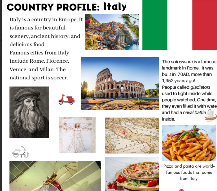 演示日"。在接下来的章节中,将向家长、学生和其他人展示日常探索的成果、国际日"。在接下来的部分中,您将加深对主题国家的了解,并用英语与与该国有联系的人进行交流。